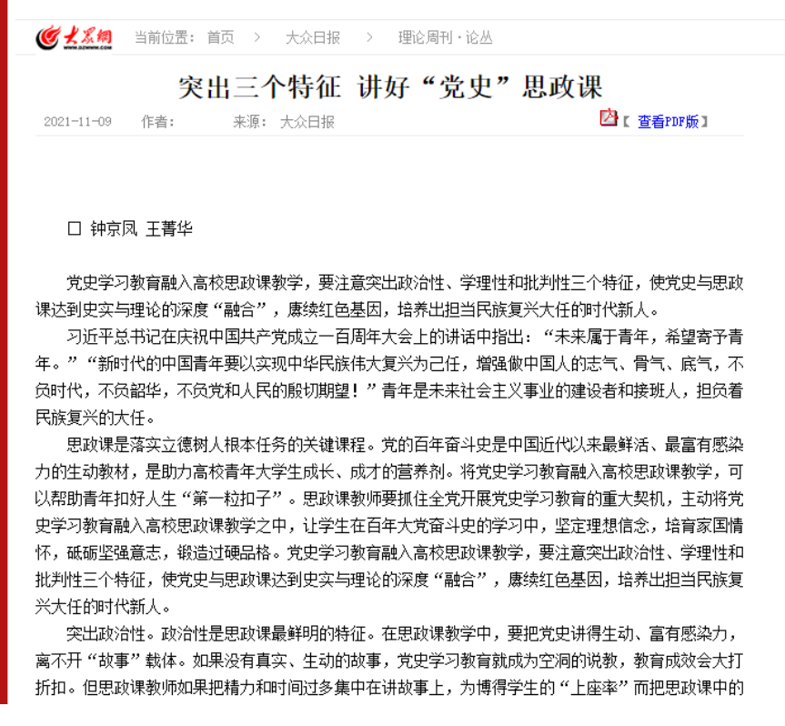 钟京凤、王菁华:突出三个特征 讲好“党史”思政课