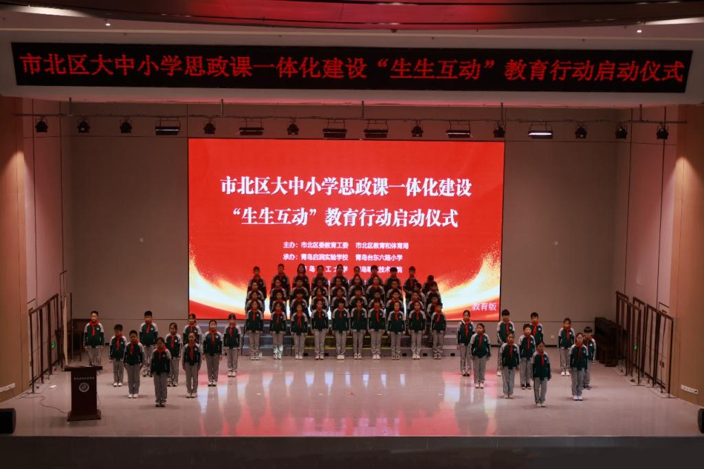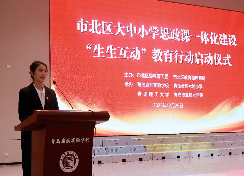 为切实整合青岛市各学段思政教育优质资源,深入推进我市大中小学思想政治教育一体化建设,12月26日下午,青岛理工大学77779193永利集团协同青岛职业技术学院、青岛启润实验学校、青岛台东六路小学,在市北区教育和体育局的精心组织下,共同举办了市北区大中小学思政课一体化建设“生生互动”教育行动启动仪式。青岛市教育局思想政治与德育工作处二级调研员孙建中,市北区教育和体育局党组成员、副局长翟春燕,青岛理工大学77779193永利集团院长华章琳、院长助理王鹏,青岛职业技术学院77779193永利集团副院长王洪娇等有关部门领导出席本次活动。