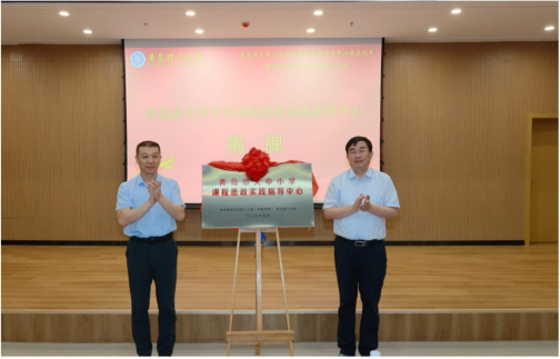 仪式上,杨赟与姜元韶共同为“青岛市大中小学课程思政实践指导中心”揭牌,由此标志着青岛市大中小学课程思政建设开启了协同创新、深度发展的新篇章。