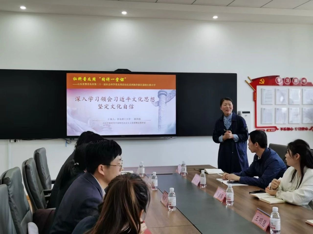 我院习近平新时代中国特色社会主义思想概论教研室在人文社科处的组织下积极响应青岛市社科联第二十一届社会科学普及周“同讲一堂课”的活动号召,于5月16日,在教研室主任薛伟娟博士的带领下走进青岛西海岸新区嘉陵江路小学进行了题为“深入学习领会习近平文化思想,坚定文化自信”的理论宣讲,嘉陵江路小学校长李晓丽与50多名党员教师参加了本次宣讲。