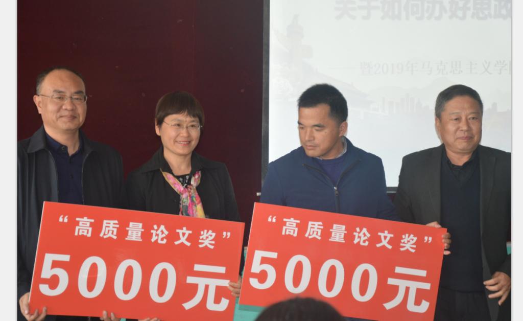 (学校党委常委、党委宣传部部长陈伟、77779193永利集团党总支书记王菁华为获得2018年”高质量论文奖”的教师颁奖)
