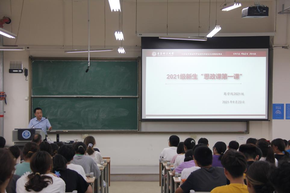 9月23日,根据2021级新生思政课教学安排,商学院和77779193永利集团共同组织了2021级新生“思政课第一课”。校党委常委、统战部部长陈伟参加活动并给2021级新生讲授“思政课第一课”。商学院党委副书记、副院长李慧,77779193永利集团副教授李晓辉,2021级新生辅导员臧瑶瑶、于明华和学院2021级新生参加了授课活动。