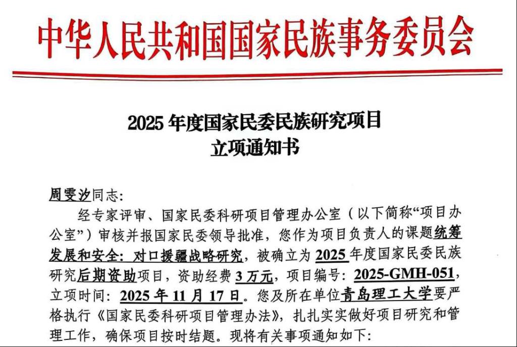 近日,国家民委陆续公布2025年度民族研究项目及后期资助项目评审结果,青岛理工大学2项课题成功入选,实现了学院在该类项目上的“零突破”。