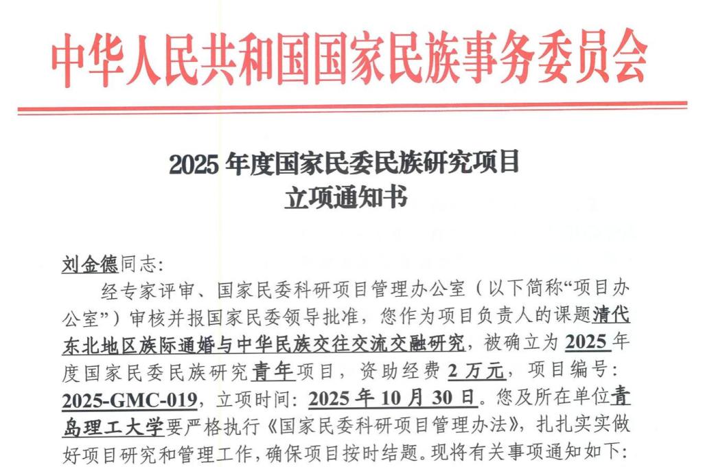 刘金德副教授主持申报的《清代东北地区族际通婚与中华民族交往交流交融研究》,获批民族研究项目公开招标青年项目;周雯汐博士主持申报的《统筹发展和安全:对口援疆战略研究》,获批民族研究项目后期资助一般课题。