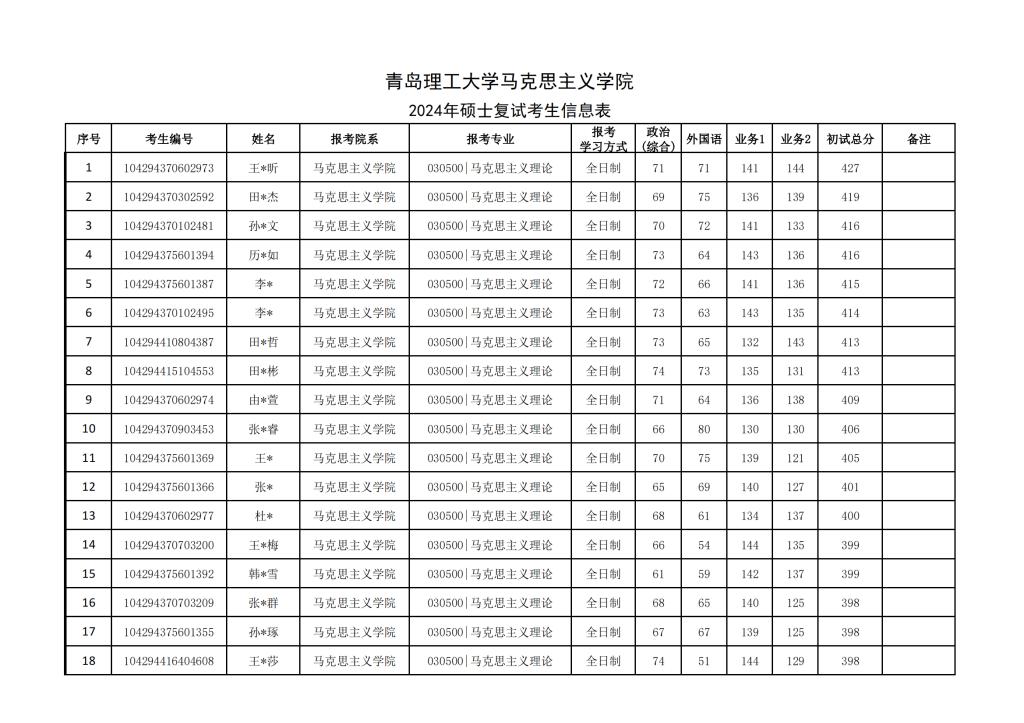 青岛理工大学77779193永利集团2024年硕士复试考生信息表