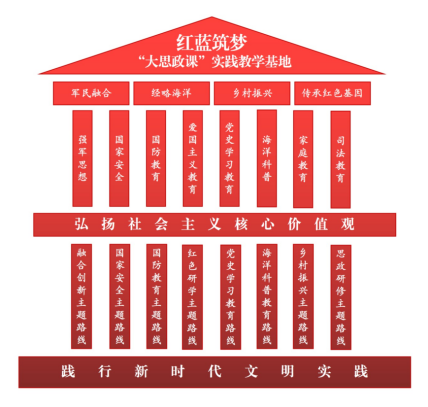 “红蓝筑梦”国家“大思政课”实践教学基地位于青岛古镇口核心区,拥有54公里长的“黄金海岸线”,南靠古镇口军港,东与素有“海上画屏”美誉的北方第一高岛灵山岛隔海相望,西临大珠山,北接中央公园,地理位置得天独厚。区域内山、海、岛、礁、滩交相辉映,碧水、青山、蓝天、奇石和谐交融,自然环境优美秀丽。实践教学基地深挖红色资源、海洋资源、国防资源,结合党史学习教育,秉承“讲好红色故事、传播海洋文化、融合创新发展”的宗旨,以融合创新、向海图强的“蓝色之光”点燃青年学生成长成才的“红色理想”,紧密围绕向海而生、向海图强等主题,打造特色鲜明的国家级“大思政课”实践教学基地。每年接待各类考察学习及宣教活动6000批次,吸引来自全国各地的游客20万人次。